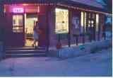 down the porch of the store at sunset.