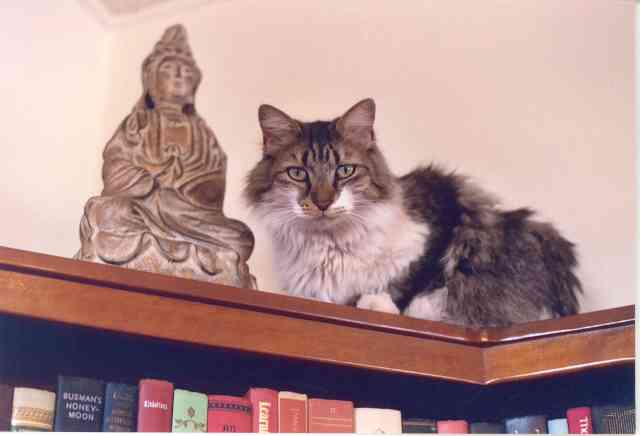 the Cat and Kwan Yin on the bookcase